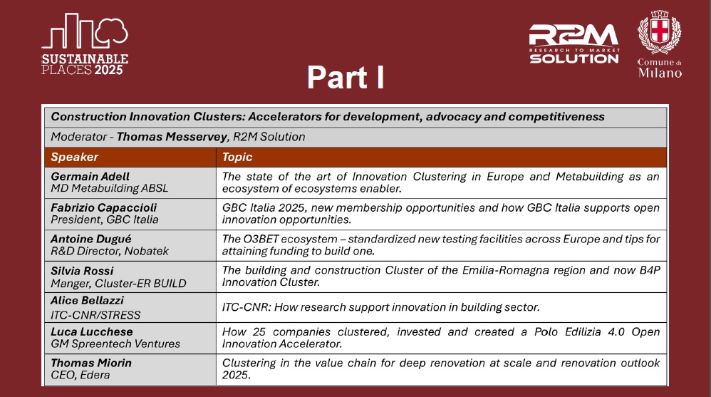 The workshop organized by R2M Solution by Sustainable Buildings where our Clust-Er Build with General Director Silvia Rossi presented the project of our cluster meet the interest of great reality such Edera Thomas Miorin, ITC-CNR Alice Bellazzi, Metabuilding ABSL Germain ADELL, GBC Italia – Chapter Lazio Fabrizio Capaccioli, NOBATEK Antoine Dugué, Spreentech Ventures Luca Lucchese.